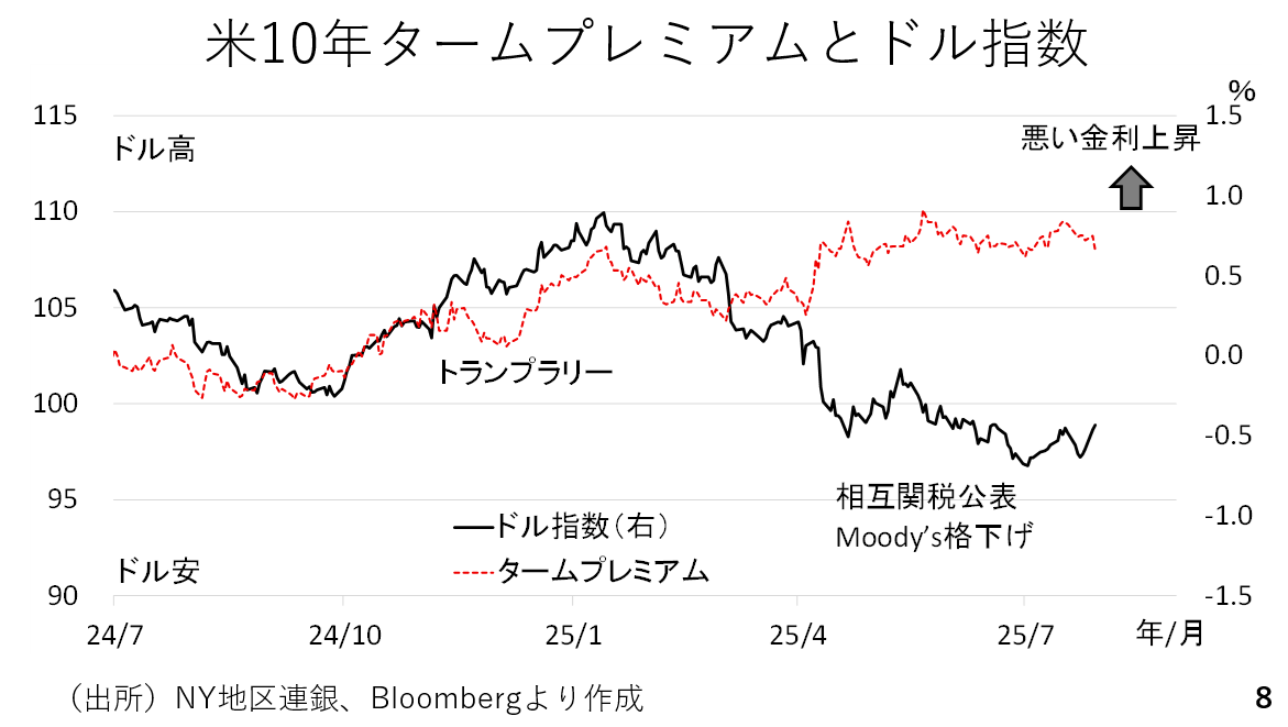 はじめにタームプレミアムです。これは拡大するほどいわゆる悪い金利上昇をもたらします。4月以降、トランプ減税の恒久化を含む積極的な財政出動を見越し、政府債務残高が拡大するとの懸念からこの10年物のタームプレミアムが拡大し、その結果として上昇した長期金利が「悪い金利上昇」とされ、かえってドル安が進みました。一方、足もとでは関税による税収増により、財政悪化への過度な懸念が和らぎ、タームプレミアムが横ばい圏で推移しています。それに連れ、ドル指数も7月以降に持ち直しに転じています。減税法案の審議を横目に悪い金利上昇とドル安が進んだ局面が変化しています(8ページ)。