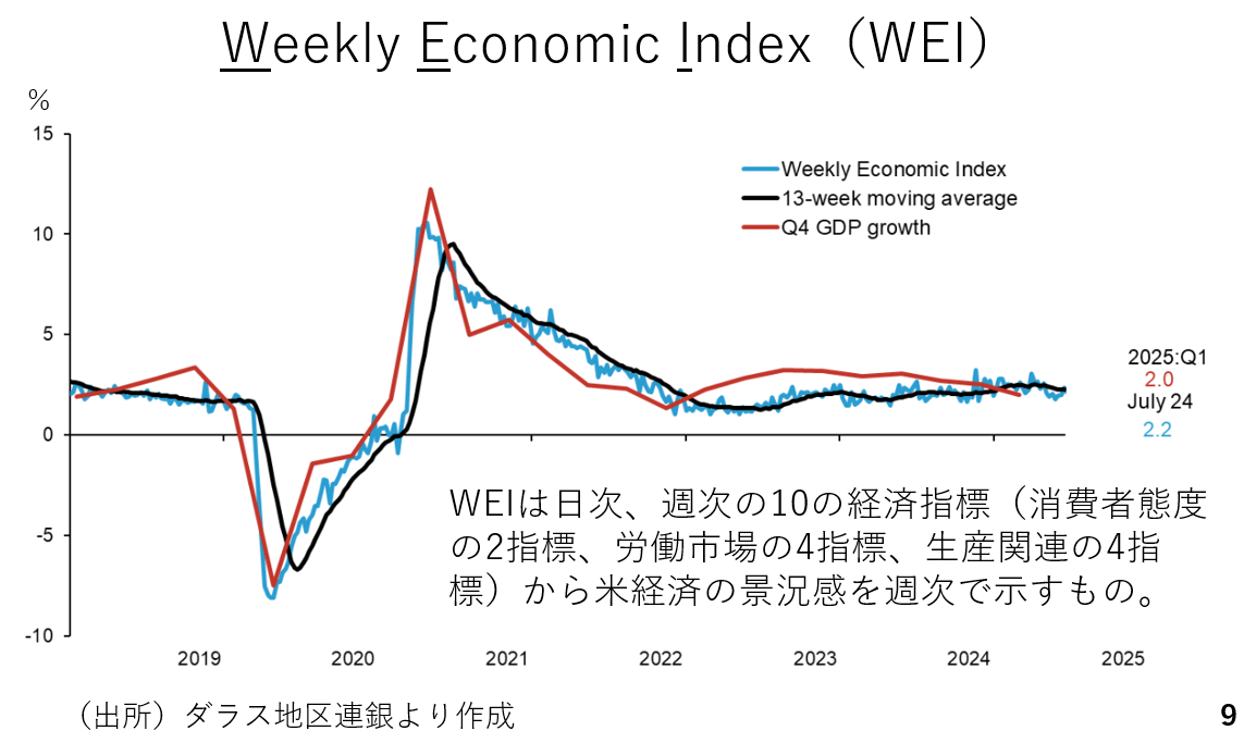 次にアメリカの景況感について、ダラス地区連銀が作成しているWeekly Economic Index(WEI)を確認しておきます。これは日次、週次の10種類の経済指標から、全米の景況感を週次で示すものです。実際、GDP統計との相関が高いことがわかります。これによると米経済は現時点で依然として底堅さを保っていると考えられます(9ページ)。