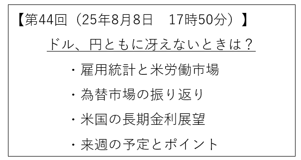 第44回のマーケットトークです。今日のテーマはドルと円がどちらもさえない時にどうなるか、について解説します。結論からいうと、クロス円が堅調に推移する可能性が高いとの内容になります。