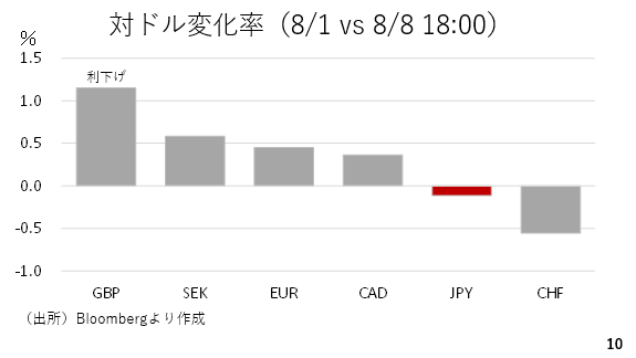 実際、今週の対ドル変化率を見てみますと多くの通貨がドルに対して上昇しており、総じてドル安の展開となりましたが、そのドルよりも弱かったのがリスク回避の場面で買われやすい傾向にある円とスイスフランとなっています(10ページ)。