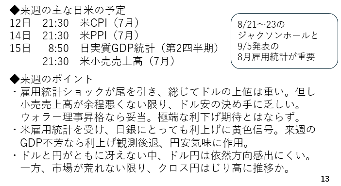 最後に来週の主な日米の予定とポイントです。来週はアメリカの物価関連の統計と小売売上高が重要です。日本では第2四半期の実質GDP統計が発表されます。