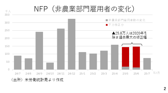 まず、改めて8月1日に発表されたアメリカの7月雇用統計の非農業部門雇用者の変化を見ておきましょう。5月と6月を合わせて25万8千人もの下方修正がなされました。修正幅としてはコロナの時期を除き過去最大です。これを受けて市場ではアメリカの労働市場やアメリカの景気そのものに対する先行きへの懸念が高まり、ドル安観測が台頭しました(2ページ)。