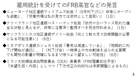 一方、サンフランシスコ連銀のデイリー総裁やミネアポリス連銀のカシュカリ総裁らは利下げにかなり軸足を移しつつあります。また、FRB理事に就任する大統領経済諮問委員会(CEA)のミラン委員長は失望を招く内容としつつ、下方修正の60%近くが季節調整によるものだと発言しました(3ページ)。