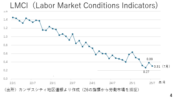 実際の労働市場がどういった状態にあるのかLMCIと呼ばれるカンザスシティー地区連銀が26種類の労働市場関連の指標から労働市場の現状を捉えた指標をみてみましょう。2022年以降、実際に労働市場の逼迫感は薄れつつあります。ただ、直近5月以降の変化をみる限り、5月、6月の非農業部門雇用者数が過去最大の修正幅を要するほど、急激に冷え込んだわけではないといった点に留意が必要でしょう(4ページ)。
