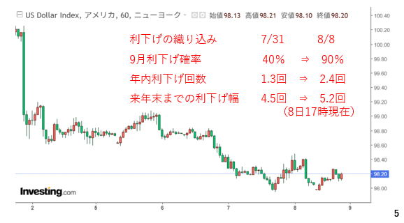また、8月雇用統計がそれほど悪くなければ、7月分の結果は指標のアヤであり、それほど米経済は悪くないとの見方から利下げ期待が後退すると考えられます。その一方、2カ月分続けて予想を下回った場合、利下げの織り込みがさらに進むことになります。具体的には年内3会合、全て利下げが行われる、または昨年同様、9月の利下げ幅が50bpになるといった見方です。このような場合、ドルにはもう一段の下落余地が出てくることから要注意です。