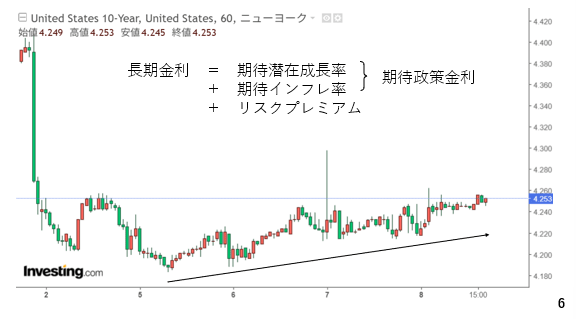 但し、アメリカの長期金利をみると、雇用統計後に大きく低下した後、今週の半ば以降はじりじりと上昇しています。改めて長期金利の構成要素を見ておきましょう。図中に記載している通り、長期金利は期待潜在成長率、期待インフレ率、リスクプレミアムの合計です。このリスクプレミアムはいわゆる「悪い金利上昇」を指します。また、潜在成長率とインフレ率の合計が本来あるべき政策金利、即ち中立金利であることからこの二つを足したものが、政策金利に対する市場の見方や予想、すなわち期待政策金利となります。雇用統計を受けて、利下げを織り込む過程で長期金利が低下したのはこの期待政策金利が低下したためと考えられます。一方、改めてインフレ期待やリスクプレミアムの動向をみてみましょう(6ページ)。