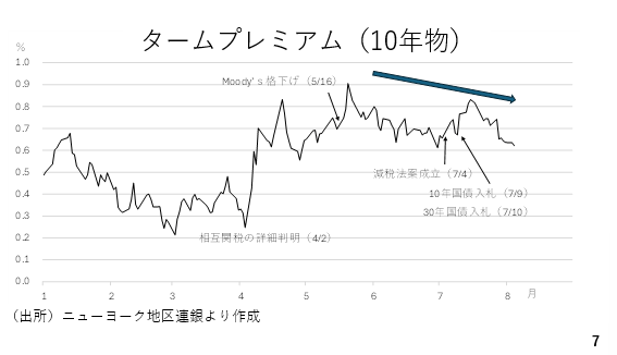一方、その動きは6月以降、徐々に落ち着きを取り戻しました。また、7月4日にはトランプ減税の恒久化を含む大型の減税法案が成立しましたが、その後の10年国債入札及び30年国債入札において堅調な需要が確認されています。総じて6月以降、タームプレミアムの拡大に歯止めがかかり、足元では低下する動きが確認できます。現在、関税による税収が年間3000億ドル程度と試算されています。減税法案に伴い、米国では向こう10年間で約3.4兆ドルの財政赤字の拡大が見込まれていますが、関税による税収の上振れが続く場合、10年間でほぼ減税による債務拡大分を穴埋めすることができる計算となります。