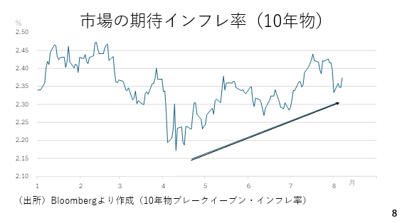 次に市場の期待インフレ率の動きを見てみましょう。これは物価連動国債と国債の利回りの差をとったブレークイーブンインフレ率です。雇用統計後、低下する動きが見られましたがトレンドとしては相互関税の詳細が判明した4月以降、上昇基調を辿っています。やはり関税によるインフレが市場では依然として意識されていると考えられます。今、市場のコンセンサスは今年の9月から四半期ごとに25bpの利下げが来年6月ごろまで続くとの見方ですが、実際にその利下げペースになる場合、すでに利下げは織り込み済みとなり、長期金利への低下圧力は限定的となります。一方、この期待インフレ率に照らせば長期金利が4%を割り込んで低下していく展開は見込みにくい状況です(8ページ)。