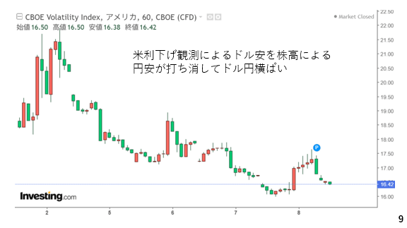 次にボラティリティ、VIX指数を見てみましょう。雇用統計後、一気にVIX指数が上昇しましたが今週は総じて低下トレンドをたどりました。市場ではアメリカの利下げ観測が台頭し、ドル安が進みましたが、その利下げ期待が株式相場の上昇をもたらし、リスク回避色の緩和とともに円安圧力を高めました。その結果、雇用統計後にドル安が進んだものの円も冴えなかったことから両者が打ち消し合い、今週のドル円の横ばい推移につながったと考えられます(9ページ)。