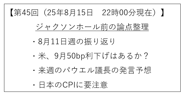 第45回マーケットトークです。今日のテーマは「ジャクソンホール前の論点整理」です。ジャクソンホールとはカンザスシティー地区連銀が毎年8月下旬に開催する経済シンポジウムです。その開催地に因んで、単にジャクソンホールと呼ばれ、市場関係者からの注目を集めています。今回はアメリカの利下げ開始時期と近いことから、いつにも増してそこでパウエル議長が何を語るのか、注目されてています。