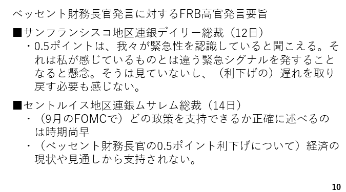 また、セントルイス地区連銀のムサレム総裁も同様です。9月のFOMCでどのような政策を支持すればいいのか分からないとしつつ、50bpの利下げは支持されないとの見方を示しました(10ページ)。