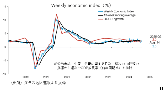 では、実際のアメリカ経済が50bp利下げを必要とする状況か、みていきましょう。まず、この動画で何度も紹介しているウィークリーエコノミックインデックスです。これは労働市場や生産、消費に関する10種類の日時及び週次の経済指標からアメリカのGDP成長率を週次で推計するもので、これまでも実際のGDPとの高い相関を持っていることが分かります。GDPが四半期に一度しか発表されないのに対し、この指標は毎週アップデートされるため非常に有益です。尚、ダラス地区連銀が公表していますがあくまでもこれは全米ベースの指標です。これによれば、8月14日時点で米経済は前年比2.5%成長を維持しており底堅く推移しています(11ページ)。