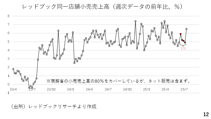 また、この10種類の指標の中から、消費に関連するレッドブックの同一店舗小売売上高の推移を見てみましょう。これはレッドブックリサーチが毎週発表しているもので、商務省の小売売上高の80%をカバーしています。但し、ネット販売は弱含んでいません。これによりますと、7月は前年比で概ね5%から6%台の伸びを示しており、先ほど発表された小売売上高がまずまずの結果だったことと整合的です。因みに、8月第1週のデータまで公表されていますが、7月を上回る高い伸びを記録しており、やはり9月に50bpの利下げを必要とするような状況とは言えません(12ページ)。