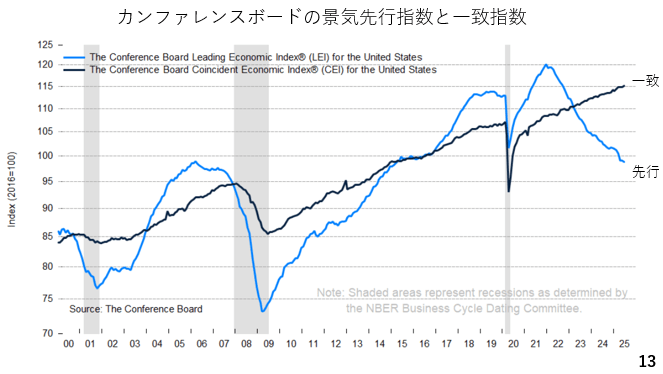 一方、アメリカの経済の先行きに対する懸念はあります。例えば、カンファレンスボードが公表している景気先行指数(青い線)の低下が続いています。これまでの経験則では景気先行指数が低下し始めてから半年から一年程度で景気後退に陥るとされ、景気の先行きに対する懸念は残ります(13ページ)。