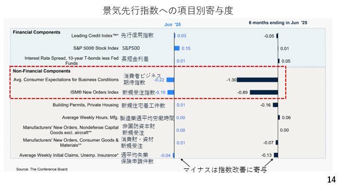 ただ重要なのは、どの項目が景気先行指数の低下に影響しているのか、です。そこで内訳をみてみますと、6月分および6月までの6カ月間のいずれにおいても、消費者ビジネス期待指数と新規受注指数が景気先行指数を押し下げています。これらはいずれも先行き不透明感を反映したものと言え、トランプ政権の関税をめぐる不透明感が影響していると考えられます。