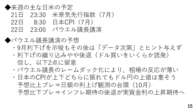 では、来週の日米の予定を確認しておきます。21日には7月の景気先行指数が発表されます。日本では22日金曜日の朝、7月の消費者物価指数が公表されます。後で触れますが要注目イベントです。また、その日の日本時間夜11時よりジャクソンホールでのパウエル議長講演が予定されています。ここでパウエル議長は労働市場の減速に照らし、まず9月の利下げをある程度示唆すると考えられます。マーケットが9月利下げをほぼ織り込んでいるだけに、逆に9月利下げがない可能性もあるのであれば明確に火消しをしなければなりません。
