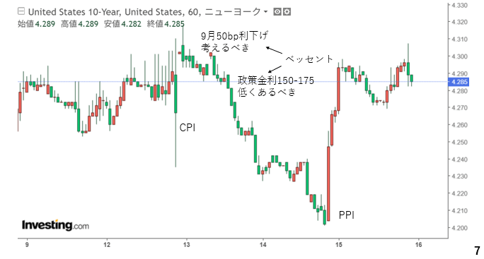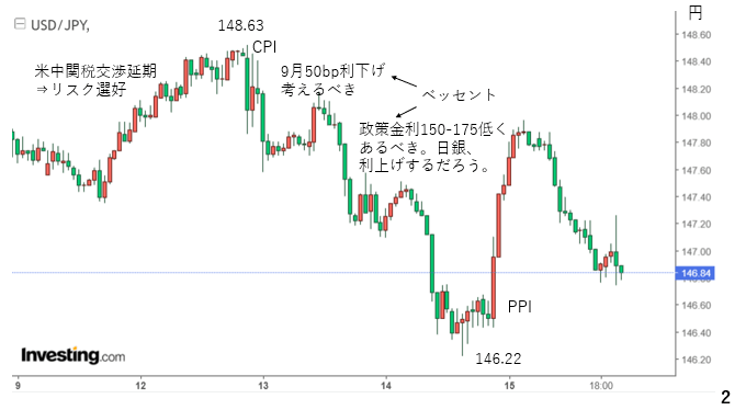 アメリカの長期金利も見ておきましょう。CPIを受けて低下する動きも見られましたがそれよりも長期金利の低下を招いたのはベッセント財務長官の発言です。ただし、生産者物価指数を受けてほぼ週初の水準まで戻っています。この長期金利の動きに照らせばドル円の戻りは鈍いと考えられます(7ページ)。