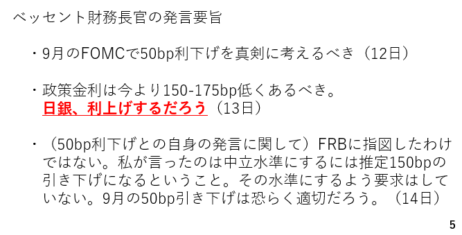 ここでベッセント財務長官の発言に対するFRB高官発言を紹介します。まず、サンフランシスコ地区連銀のデイリー総裁は、50bp利下げはFRBが緊急性を認識しているとの誤ったメッセージを発する可能性に懸念を表明しました。そこまでアメリカ経済が悪いとはみていないということです。因みに、デイリー総裁は7月雇用統計を受け、9月利下げに傾いた総裁ですが、さすがに50bp利下げは不要との立場です。