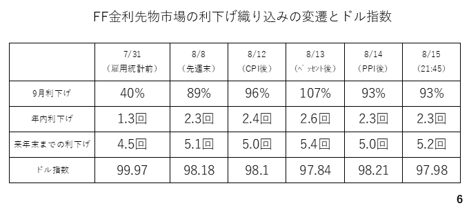 では、アメリカの利下げの織り込みの変遷を確認します。7月雇用統計の前は9月の利下げを40%しかおり込んでいませんでした。これが、雇用統計を踏まえ先週末(8/8)の時点で89%、年内の利下げ回数を2.3回織り込むに至り、100近かったドル指数も2%程度下落しました。さらに、CPIとベッセント財務長官の発言後、さらに利下げの織り込みが進みました。特に、ベッセント財務長官の発言後、9月の利下げの織り込みが107%に達しています。これは25bpの利下げをフルに織り込んだ上、50bp利下げの可能性も7%ほど織り込んだことを意味します。但し、その後はアメリカの生産者物価指数を受けて利下げの織り込みが後退しています(6ページ)。