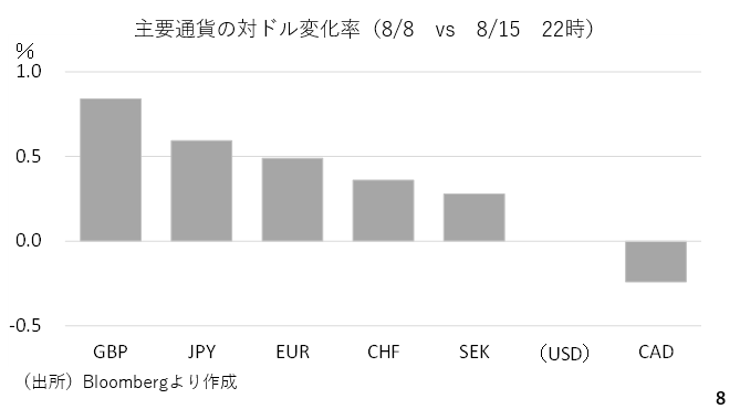 一方、ここまでみた通り、アメリカ経済は9月に50bp利下げを必要とするほど悪いわけではない上、関税交渉をめぐる不透明感がまだ残っており、その影響の見極めにはなお時間を要します。加えて、インフレの伸びがやや加速していたことも踏まえると9月利下げのさらにその先についてはデータ次第と述べるにとどめ、明確なヒントは与えてくれないでしょう。このためジャクソンホール後、利下げの織り込みがやや後退する結果、ドル買いのイベントとなる可能性がありそうです。