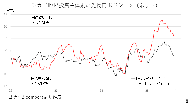 IMMポジションを投資主体別にみますと、ヘッジファンドなどを含むレバレッジドファンド勢は7月に入り、円ロングから円ショートに振っていたことがわかります。実際、この時期、ドル円は150円台を回復するなど勢いよく上昇していました。しかし、7月雇用統計を受け、ドル円の続伸が阻まれたことから足元ではレバレッジドファンド勢の円の買い戻しが誘発されやすい状況と考えられ、しばらくドル円の上値は重そうです(9ページ)。