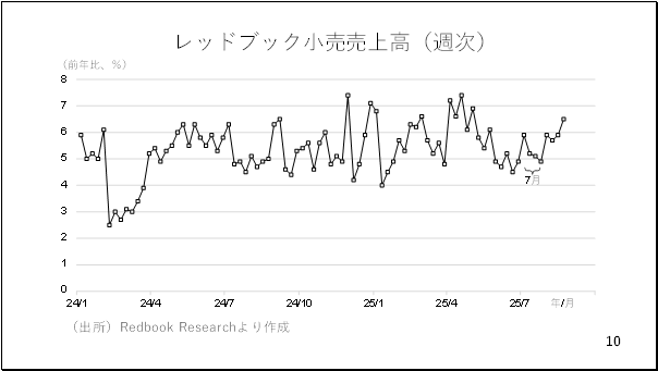 このWEI算出に際し、比重の高い小売売上高のデータを見てみましょう。レッドブックリサーチが公表するこの週次の小売データは商務省が発表している小売売上高の8割以上のデータを占めています。尚、ネット販売は含まれていません。現在、8月の第4週目までのデータが発表されていますが、今月の個人消費は依然として堅調さを保っているようです。その主因は堅調に推移するアメリカの株式相場でしょう。アメリカの個人消費は株高による資産効果が強く働くとされているからです(10ページ)。