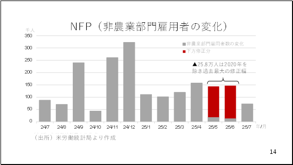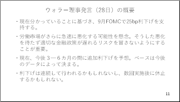 もともとウォラー理事は関税がインフレに与える影響は一時的なもので、寧ろ労働市場の悪化に対し、ワードルッキングな対応が必要との意見です。一部ではトランプ大統領に指名されただけに、かなり積極的に利下げを主張するのでは、との見方もありますが、実際にそういったことはないでしょう(11ページ)。