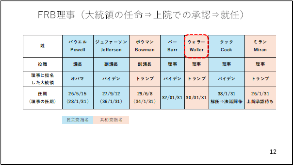 今週はクック理事が解任されたことを受け、FRBの独立性や金融政策の中立性への疑念からドル安が進む場面もみられました。そこで、現時点のFRB理事の陣容を整理します。
