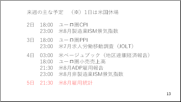 では来週の予定を振り返ってみておきましょう。来週はユーロ圏の物価指標のほかアメリカでは重要な指標が続きます。中でも注目くされるのがアメリカの8月の雇用統計です。そこで前回の結果を振り返っておきましょう(13ページ)。