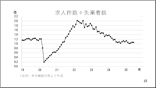 そのほかパウエル議長が重視しているとされる求人件数の対失業者数の倍率も、ピーク時から低下傾向にあります。ただし、昨年の終盤以降は横ばいの動きとなっています(15ページ)。
