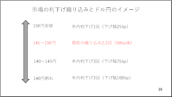 そこで利下げの織り込みとドル円の水準感のイメージを整理しました。現在、市場は年内、約2回の利下げを織り込んでいます。この見方が続く限り、ドル円は145円から150円のレンジを脱することが難しそうです。