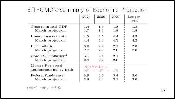 一方、4.1%なら年内の追加利下げはないものとみなされ、かなりのドル買いが進むでしょう。反対に3.6%なら年内、2回の追加利下げ(即ち9月を含めて3回利下げ)を見込んでいることになり、利下げの織り込みがさらに進み、ドル安が進みそうです。さらに、2026年末の水準も重要です。現在市場は来年の年末までに9月の利下げを含めて約5.5回の利下げを織り込んでいます。ところが6月のSEPは来年の年末までに計3回の利下げしか見込んでいませんでした。この2026年末の数字も相場に大きく影響するでしょう。