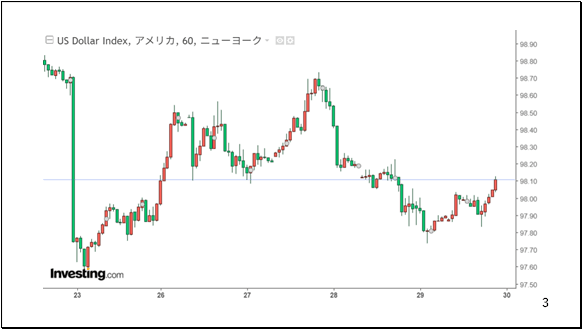 ドル指数の対象6通貨の今週の対ドル変化率を見ると、ドルより強かったのはカナダドルおよびスウェーデンクローナだけでした。そのほか4通貨はドルに対し、下落しています。今週のドルは底堅く推移したと見ることもできます(4ページ)。