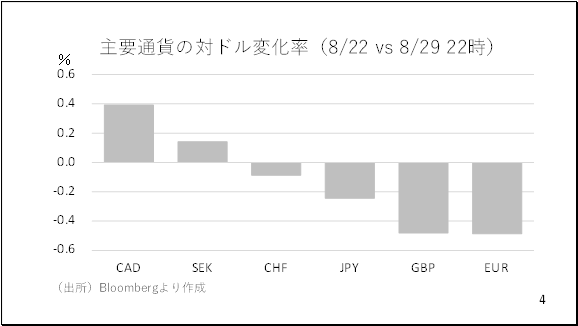 一方、トランプ大統領がFRBのクック理事を解任すると報道され、市場では中央銀行の独立性やドルの信認が低下するとの見方からドル売りが進む場面も見られました。ただ、今週の安値は146円66銭と先週の安値を下抜けできず、足元では持ち直しています(2ページ)。ドル指数も同様の動きでした(3ページ)。