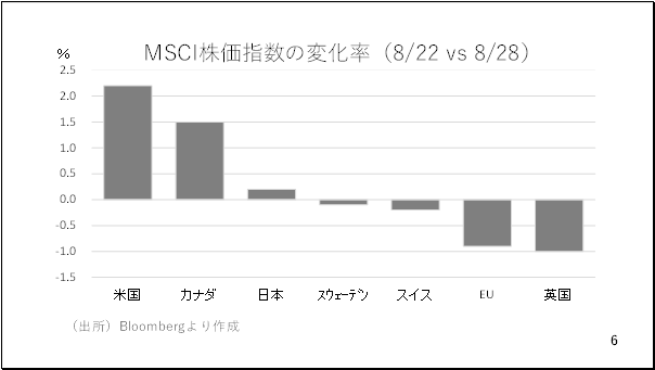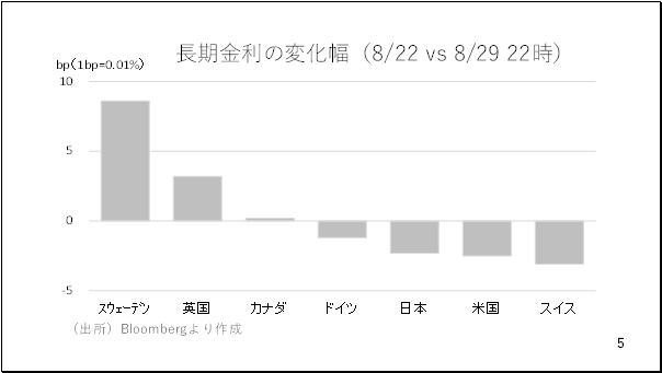 そこで今週の長期金利の動きを見てみましょう。アメリカの長期金利は2~3bpほど低下しましたが、多くの国でも長期金利が低下しました。また、スウェーデンとイギリスの長期金利は上昇していますが、イギリスの上昇幅は数ベーシスに留まっており、総じてみてドル安が進む長期金利の動きとはなりませんでした(5ページ)。