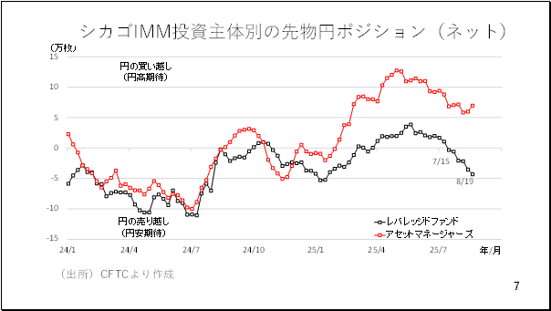 ここへきてドル円相場に膠着感が漂っています。投資家の間でも円相場に対する見方が割れているようです。例えば、投資主体別にみた円の先物ポジションの動向を見ると、年金基金など、やや長めの期間で投資するアセットマネージャーズは、ここへきて再び円高を見越して円ロングを積み増す動きに転じています。一方、ヘッジファンドを含むとされるレバレッジとファンド勢は円安を見越し、円ショートをさらに拡大させています(7ページ)。