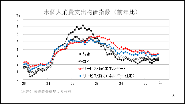 次に、先ほど発表された個人消費支出物価指数を見ておきましょう。基本的に先日発表された消費者物価指数に似ています。即ち、ヘッドライン(総合)こそ、横ばい圏にとどまり、インフレの落ち着きぶりを示していますが、食品とエネルギーを除いたコアやサービス価格についてはじわりとインフレに持ち直しの兆しが伺えます(8ページ)。こうした一定のインフレ圧力が残っている背景に足元の景気の底堅さが挙げられるでしょう。
