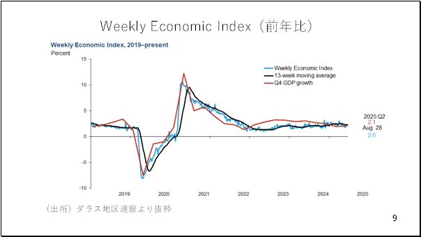 そこで週次のGDP統計ともいわれるアトランタ地区連銀公表のWeekly Economic Index(WEI)を見てみましょう。これは生産や消費、雇用に関する10種類の日次および週次データを元に、現在のアメリカのGDP成長率を推計しているものです。これによれば、現在アメリカ経済は前年比で2.6%成長のペースです(9ページ)。