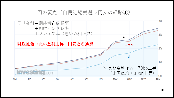 長期金利は、期待潜在成長率と期待インフレ率とプレミアムの合計ですが、このプレミアムの拡大による長期金利の上昇が「悪い金利上昇」です。この場合、当該通貨は金利上昇とは逆に値下がりする傾向にあります。