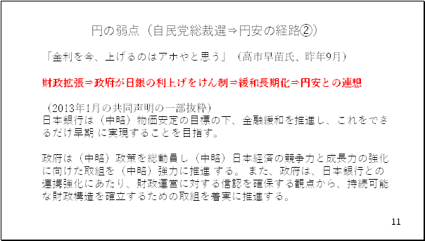 そうした中にあって、政府が財政を拡張するときに、たとえ正常化であっても方向としては金融引き締めに該当する利上げを日銀が進めることができるのか、市場は疑問視しているのです。実際、昨年9月の自民党総裁選の第1回投票でトップに躍り出た高市早苗氏は当時、日銀の利上げについて非常に強い表現でけん制しています(スライド 11)。
