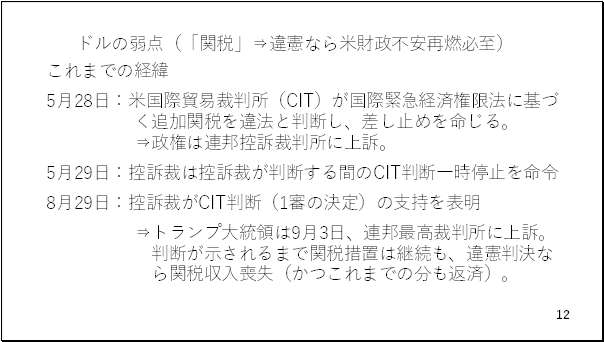 一方、ここにきてドルにも弱点が浮上してきました。それはトランプ関税が違憲となる可能性が出てきたことです。これまでの経緯を振り返ると、まず5月28日に米国の国際貿易裁判所が追加関税を違法と判断し、差し止めを命じました。また、8月29日には控訴裁裁判所も国際貿易裁判所の判断を支持すると表明したのです。その結果、トランプ大統領が9月3日、連邦最高裁判所に上訴しました。