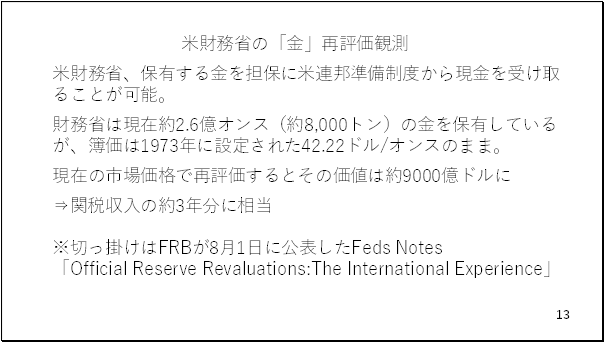 仮にこれを現在の市場価格で再評価すると関税収入の約3年分に相当する約9000億ドルもの評価益が発生します。米国の財政赤字に照らせば、その規模は限定的とも言えますが、少なくとも短期的には財政悪化への懸念を和らげるインパクトを持つ可能性があり、こちらの議論の行方にも注目です(スライド 13)。