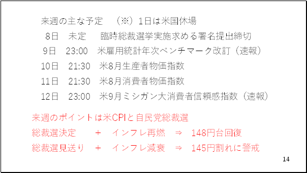 一方、反対に自民党の臨時総裁選が見送りとなった上、インフレの減衰が確認された場合、最大で145円を割り込む展開にも注意が必要です(スライド 14)。