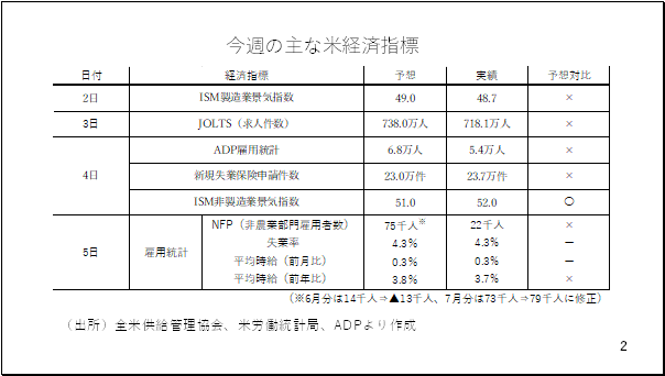 はじめに今週の主な米国の経済指標を振り返っておきましょう。右側の列に予想を下回ったものには×印、上回ったものには〇印を記載しています。今週は総じて予想を下回る指標が目立ちました。ISM景気指数に関して言えば、非製造業景気指数が予想を上回ったほか、製造業についても予想をわずかに下回った程度です。また、新規受注から在庫を差し引いた数値もプラス圏に浮上し、先々の改善が見込まれます。それでも雇用関連の経済指標の悪化が目立ちました(スライド2)。