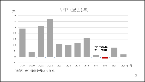 雇用統計では、失業率こそ予想通りでしたが、それでも前月から0.1%ポイント上昇。非農業部門雇用者数も予想を下回った上、6月分がさらに下方修正され、マイナスを記録しました。マイナス圏に落ち込むのはコロナ禍以降で初めてです(スライド 3)。