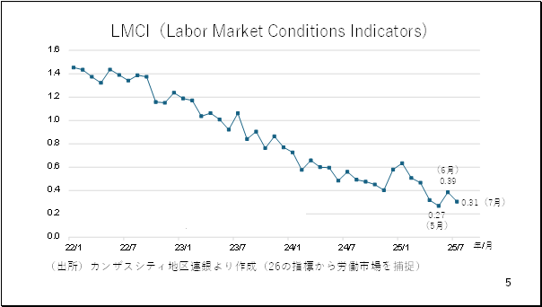 カンザスシティー地区連銀が公表しているLMCIにも注目です。これは雇用統計の翌週火曜日(即ち9日)に発表されます。全部で20種類以上の労働市場に関する指標から米国の労働市場全体の動きを捕捉するものです。これによれば雇用統計が悪化した5月から7月にかけてそこまでの極端な落ち込みはみられませんでした。市場での注目度が高くなく、この結果を受けてマーケットが大きく動くわけではありませんが、労働市場の全体像をつかむ上で、確認をしておきたいところです(スライド 5)。