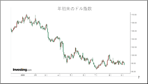 この結果、為替市場ではドル安が進みました。過去1年のドル指数を振り返りますと、7月までドル安が進んだものの、それ以降は関税交渉の進展と関税収入による財政悪化不安の緩和により、ドルが持ち直しました。一方、8月1日に発表された7月の雇用統計を受けて再び上値が重くなり、先ほどの8月雇用統計を受け、最近の安値圏までドル安が進んでいる状態です(スライド 7)。