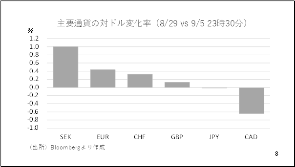 次に、今週の主要通貨の対ドル変化率を見ておきましょう。スウェーデンクローナ、ユーロ、スイスフラン、英ポンドがドルに対して上昇しており、全体としてドルが冴えませんでした。しかし、カナダドルはそのドルに対して下落しており、円も概ね横ばいと冴えませんでした(スライド 8)。