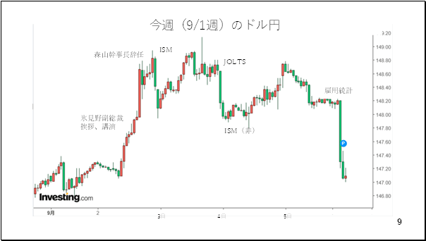 また、森山幹事長が辞任を表明したことも円安を後押ししました。この点については後ほども触れますが、総裁選後の財政拡張への思惑が円安を招いていると考えられます。その後、予想を下回ったISM製造業景気指数を受けて反落した後、一旦ドル買いが優勢となったものの、求人件数などのJOLTの結果を受けて反落しました。非製造業ISM景気指数を受けて持ち直していましたが、先ほどの雇用統計を受けて急落している状況です(スライド 9)。