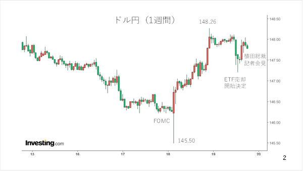 但し、記者会見で植田総裁が依然として利上げに慎重な姿勢を示した上、ETFの売却も完了するまで100年以上を要する緩やかなペースであることから、次第に株安・円高の動きが反転しました。現在、ドル円は148円近辺まで反発しています(スライド 2)。